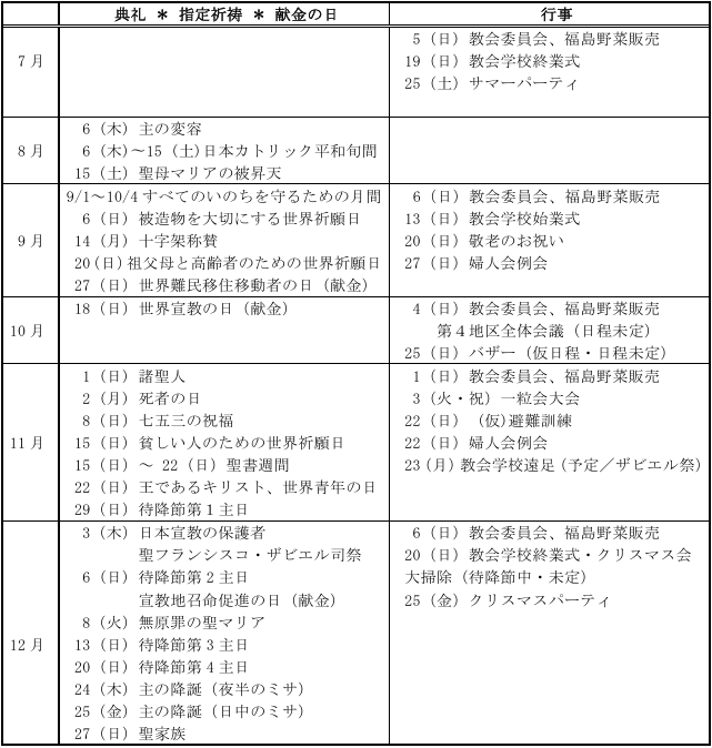 | 11(日) | 世界召命祈願日 | 4(日) | 教会委員会、福島野菜販売 | |