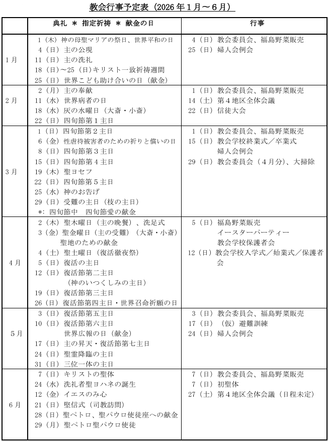| 1(水) | 神の母聖マリアの祭日 世界平和の日 | 5(日) | 教会委員会、福島野菜販売 | |